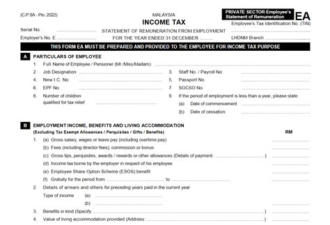 Web guide notes for completing forms c.p.8a (ea) and c.p.8c (ec) in accordance with subsection 83(1a) of the income tax. Web learn the deadline, purpose and format of form ea, a statement of remuneration for tax season in malaysia. Web download the ea form 2023 for the year ended 31 december 2022, a tax form for private sector employees in malaysia. Web find the download link for various forms, including the ea form 2023, for the year 2023 and previous years. Web download the latest version of the ea form for 2023 in malay and english, including the pin number.