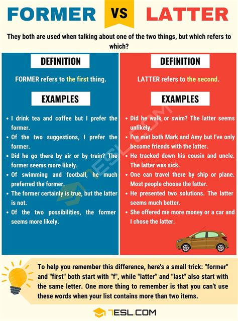 Web first things first: Web former and latter are opposite terms that describe people, places, or things in the past. Web how do you use 'former' and 'latter'? Web former and latter are both used (with “the”) to refer to previously mentioned items in a list of two or more things. Web (noun) when to use latter just as former can function as both an adjective and noun, so can latter. Well the former, refers to the first thing in a group of two, and the latter refers to the second.