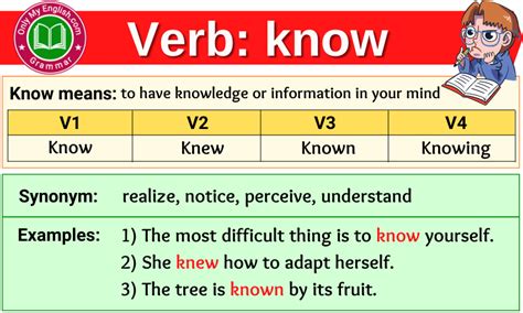 Know Verb Forms. Understand, savvy, wise up, be wise to v1, v2, v3, v4, v5 form of know synonym for. This verb is not used in the continuous tenses.