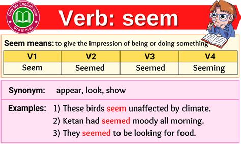 Seem Verb Forms. Web verb forms (not used in the progressive tenses) to give the impression of being or doing something synonym appear + adj. Appear, come in sight v1, v2, v3, v4, v5 form of seem synonym for seem;